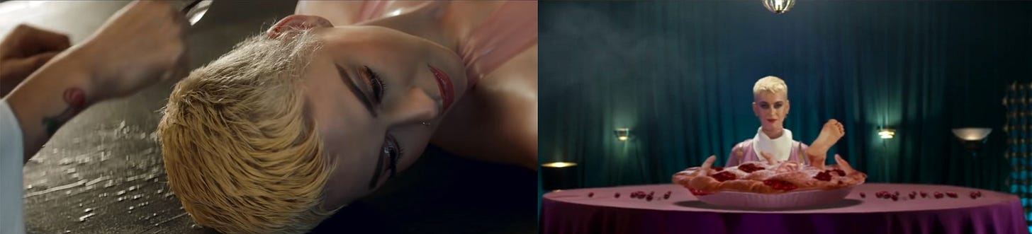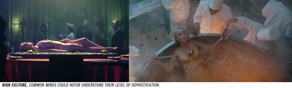 New World Order puppet Katy Perry knows a thing or two about cannibalism and we can learn a lot by paying attention to the social engineering programming of her music videos. The video for the song Bon Appetit is an extremely disturbing glamorized confirmation of pro-cannibalism complete with elitist occult ritual overtones and overt sexuality as the singer’s body is being prepped, basted, cooked and presented for consumption. Cannibalism here is presented as a high end dining experience for sophisticates and something to be understood by elites with discerning and discriminating tastes. This elitist message is also explored in the fascinating film Dumplings, which incorporates human fetuses into dumplings that reverse the aging process, a delicacy offered only to select clientele. This is a luxury, like art, that requires big money and upper echelon exclusivity to gain entry to this level of refinement. The ritualistic overtones of Perry’s Bon Appetit include a dark, secret dining room where some are blindfolded a la occult-tinged Rothschild/Illuminati Eyes Wide Shut-type parties. The video implies that this is how they do and maybe if we had the money and the proper connections, we might be able to join their sophisticated ranks too. No, thanks.