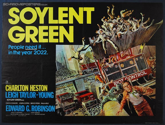 Soylent Green was released during a time of Green Agenda percolation. From the outset we have been made to accept that anything with the word ‘green’ attached to it is good for us. The environmental organization Greenpeace was founded in 1971 with an agenda focused on climate change, deforestation, and other environmental concerns. Just two years later we saw the release of Soylent Green which I imagine by then was able to easily establish itself into our subconscious minds as being something beneficial to both us and to the environment, regardless of how horribly it might be presented in the movie. In the Greenpeace saturation campaigns of the 70s, we were sold on their green future and in the post-apocalyptic world of Soylent Green, we are not only sold on their green product, but we need it.