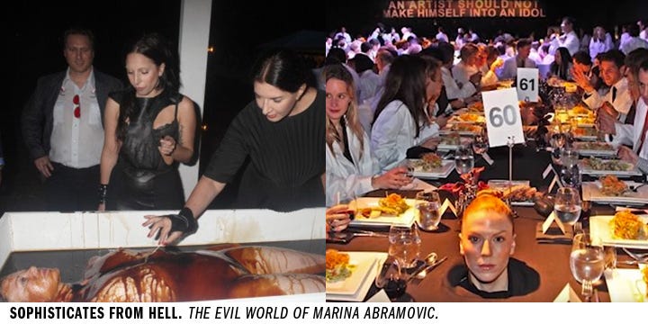 Besides Abramovic’s blood rituals and performance art that I believe is designed in part to extract lifeforce energy from those who are unfortunate enough to encounter it. Abramovic is also well known for the inordinate number of celebrities who seem to worship her and treat her as a goddess. The cannibalistic rituals that she presents as performative ‘art’ are well attended by cultured snobs eager to participate in the depravity that the art world elevates to a level of high art.
