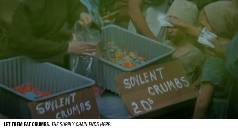 The Soylent Green product is not unlike countless other products we might find on our grocery storeshelves one of which is actually named Soylent. These products often have labels that claim ‘Real Cheese’, ‘Natural Flavors’, ‘Organic’, etc.—these questionable selling points might sound good, but while they loudly hype their supposed advantages, what are they not telling us? It’s easy to be glamoured by nice packaging, but we are continuously pressured to engage in this deceptive form of marketing even when we try to make sense of undecipherable ingredients lists or when we agree to have our privacy violated because we don’t want to read or can’t fully understand lengthy Terms of Service agreements. The point is that we never really know what we’re getting.