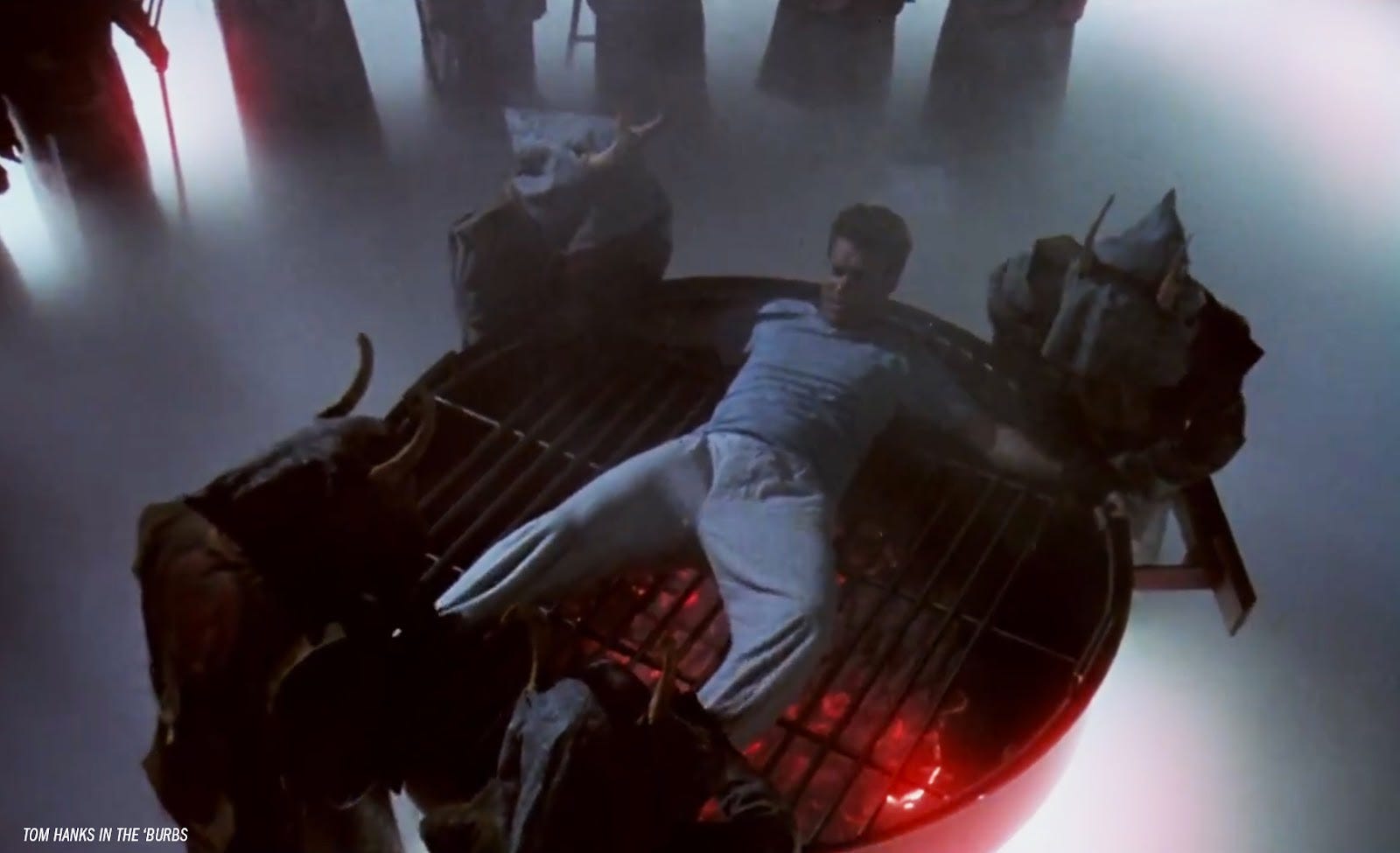 I don’t think the idea of cannibalism disgusts us anymore. Sure, plenty are revolted at the idea, but since Soylent Green we have seen countless cannibal comedies like Motel Hell and Slither (which I quite like) that have pushed the boundaries of the taboo from comedy toward domesticity and faux sophistication. In Joe Dante’s The ‘Burbs, a man imagines himself at an demonic ritual as the main course laid out on an oversized Bar-B-Q grill and in Parents, the opening scenes depict a clean-cut cannibal couple doing some similar outdoor grilling, creating a perverse reimagining of American Gothic normality. Of course Parents and The ‘Burbs were played for laughs, but there were none to actually be had in either of these movies. But it’s the taming of the subject that is important here and who better to make light of ritualistic cannibalism than the man that Hollywood and the media have determined to be the best guy in the world—the good neighbor, best friend, safe, trustworthy, life saver, clear thinking, intelligent hero—Tom Hanks. Hanks has done more than his share in contributing to our conditioning and it remains to be seen how deep our programming has gone if some of the darker rumblings out of Hollywood were ever to emerge.